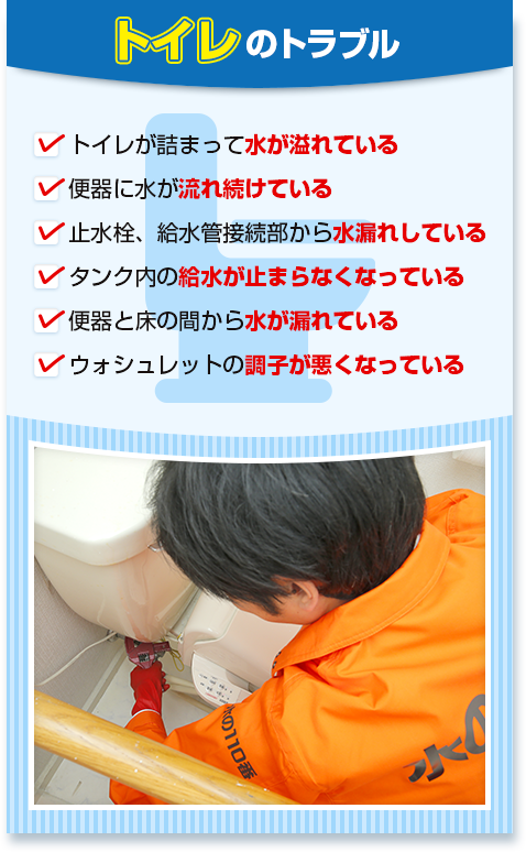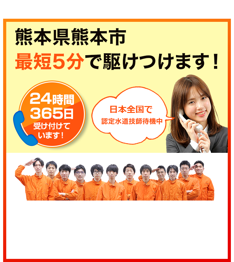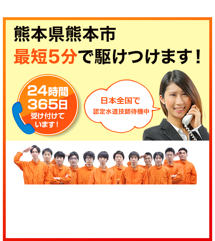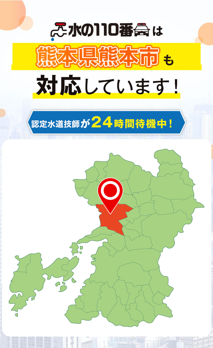 熊本市でトイレつまり・水漏れ、熊本城から水前寺公園まで、最短5分で対応。365日、熊本市のどの地区にも迅速に駆けつけ、水回りのトラブルを即解決します。